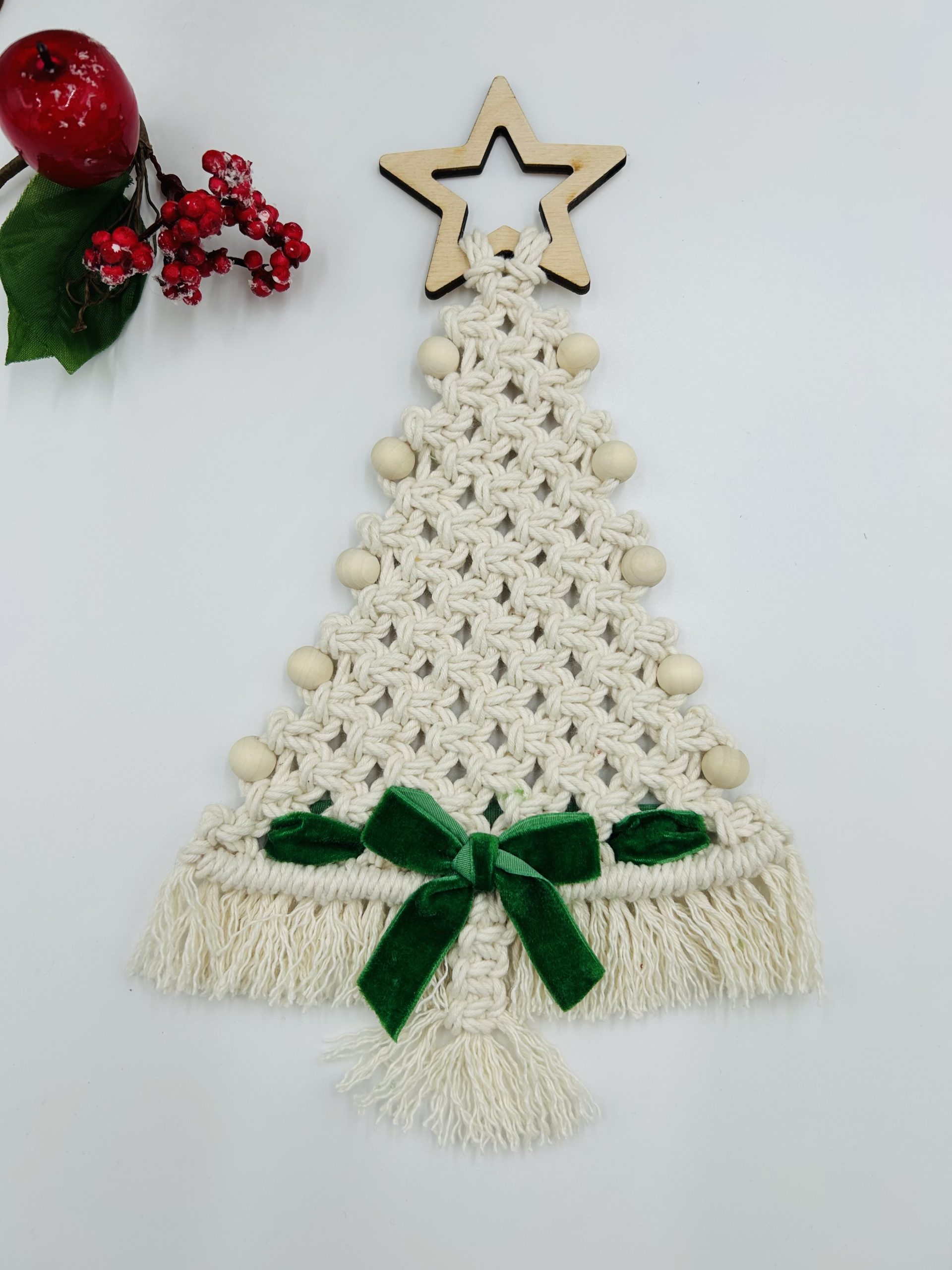 Wprowadź świąteczny klimat do swojego domu dzięki tej wyjątkowej dekoracji w stylu boho! Choinka wykonana metodą makramy została umieszczona na drewnianej gwiazdce, tworząc naturalną i przytulną ozdobę, która doskonale wpisuje się w zimowy nastrój.