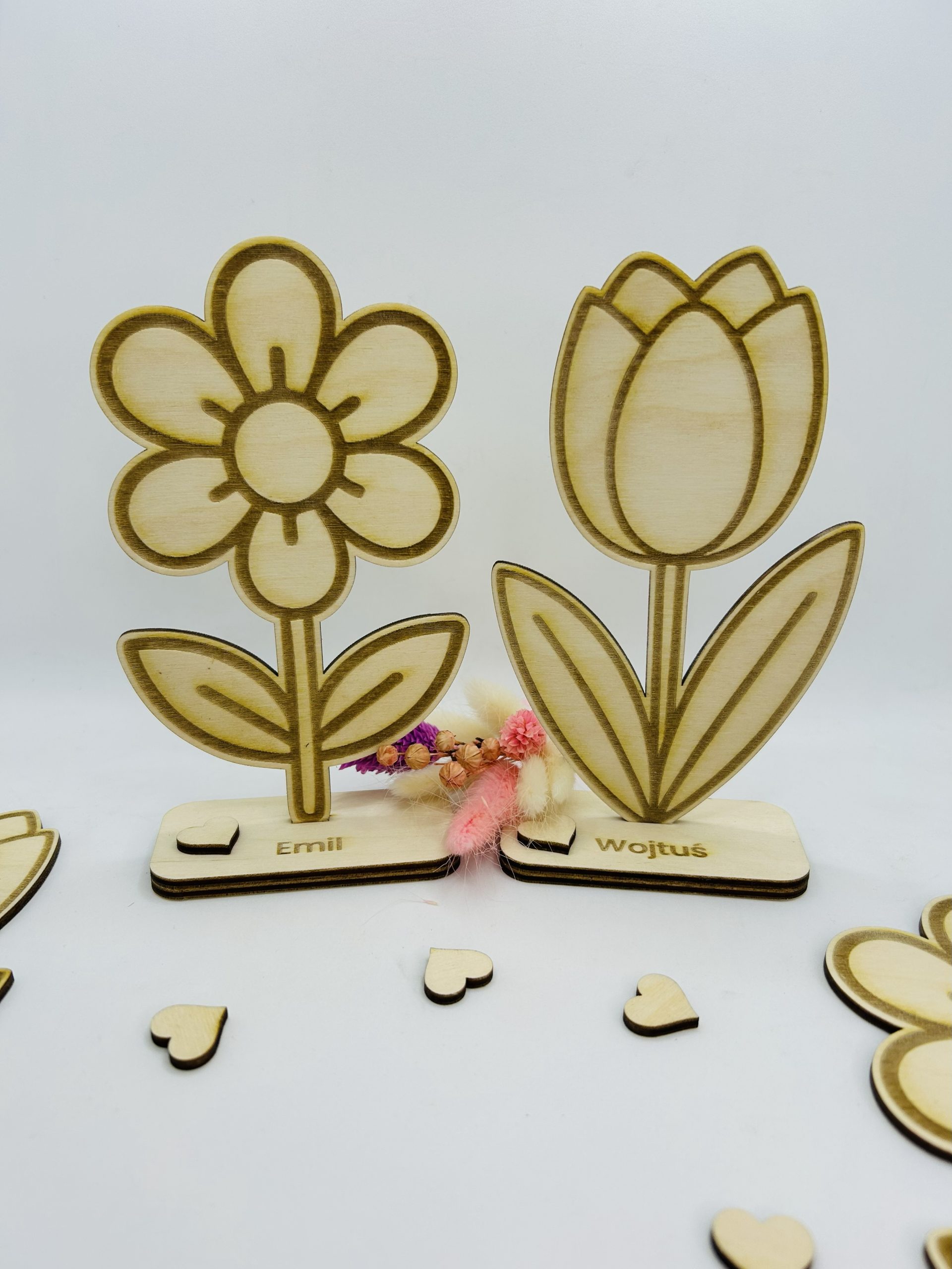 - 10 drewnianych kwiatków z podstawkami