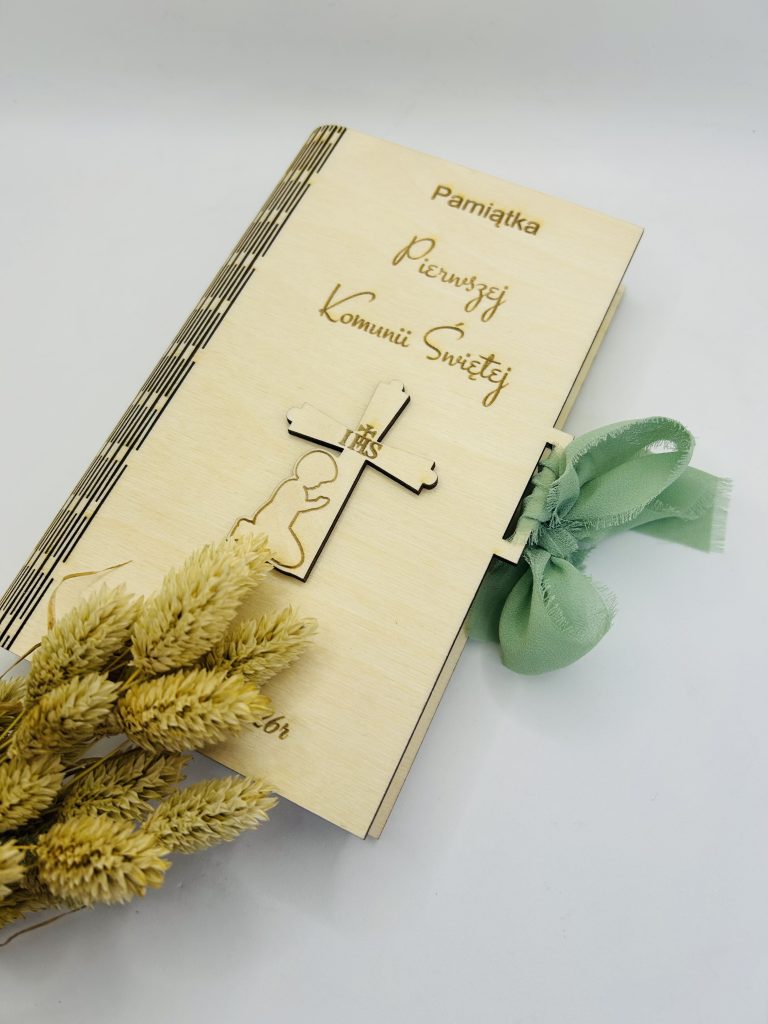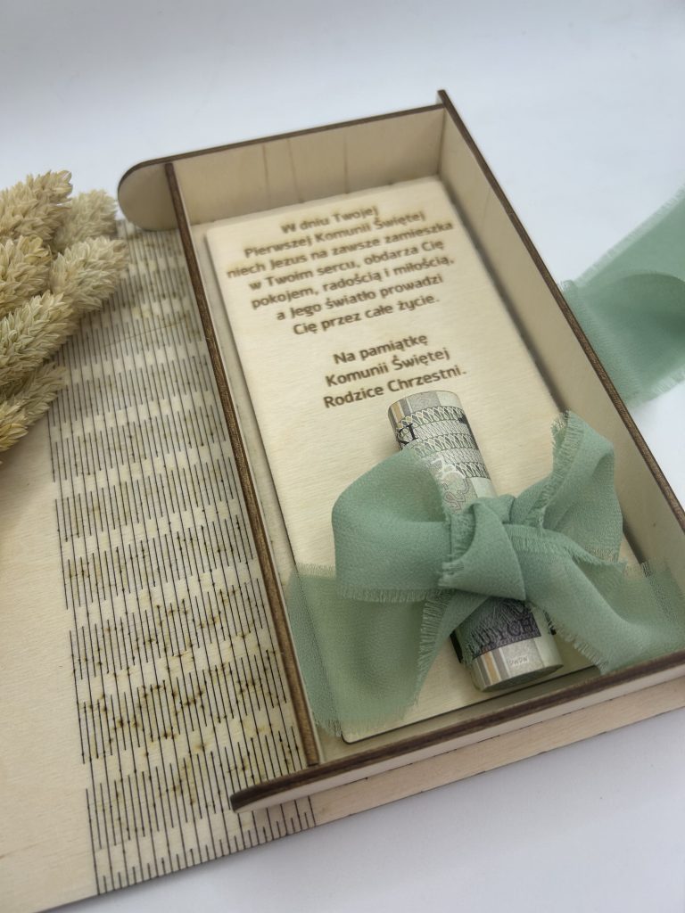 Wyjątkowa okazja zasługuje na wyjątkową oprawę. Nasze drewniane pudełko komunijne to elegancka i symboliczna forma wręczenia prezentu pieniężnego. Naturalna sklejka, subtelny grawer i możliwość personalizacji tworzą piękną pamiątkę na lata.