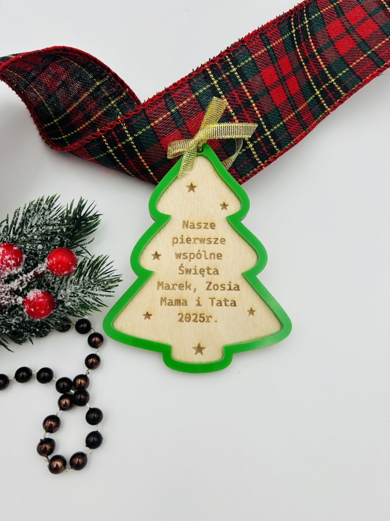 Personalizowana drewniana choinka z dodatkiem plexi (zielona) – elegancka świąteczna dekoracja