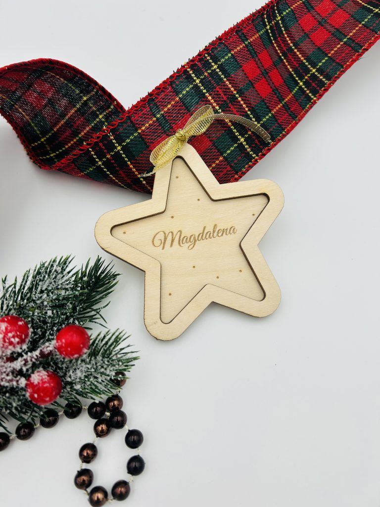 Dodaj swojej choince wyjątkowego charakteru dzięki personalizowanej gwiazdce wykonanej z naturalnego drewna. To ponadczasowa, elegancka ozdoba, która pięknie komponuje się z tradycyjnymi i nowoczesnymi dekoracjami świątecznymi.