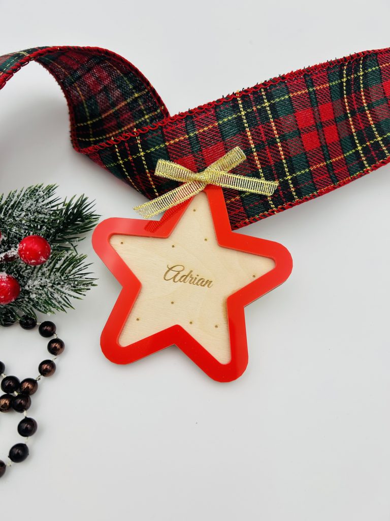 Wprowadź na swoją choinkę odrobinę elegancji dzięki personalizowanej gwiazdce wykonanej z drewna z dekoracyjnym dodatkiem plexi. To nowoczesna, a jednocześnie subtelna ozdoba, która przyciąga wzrok i pięknie odbija światło świątecznych lampek.