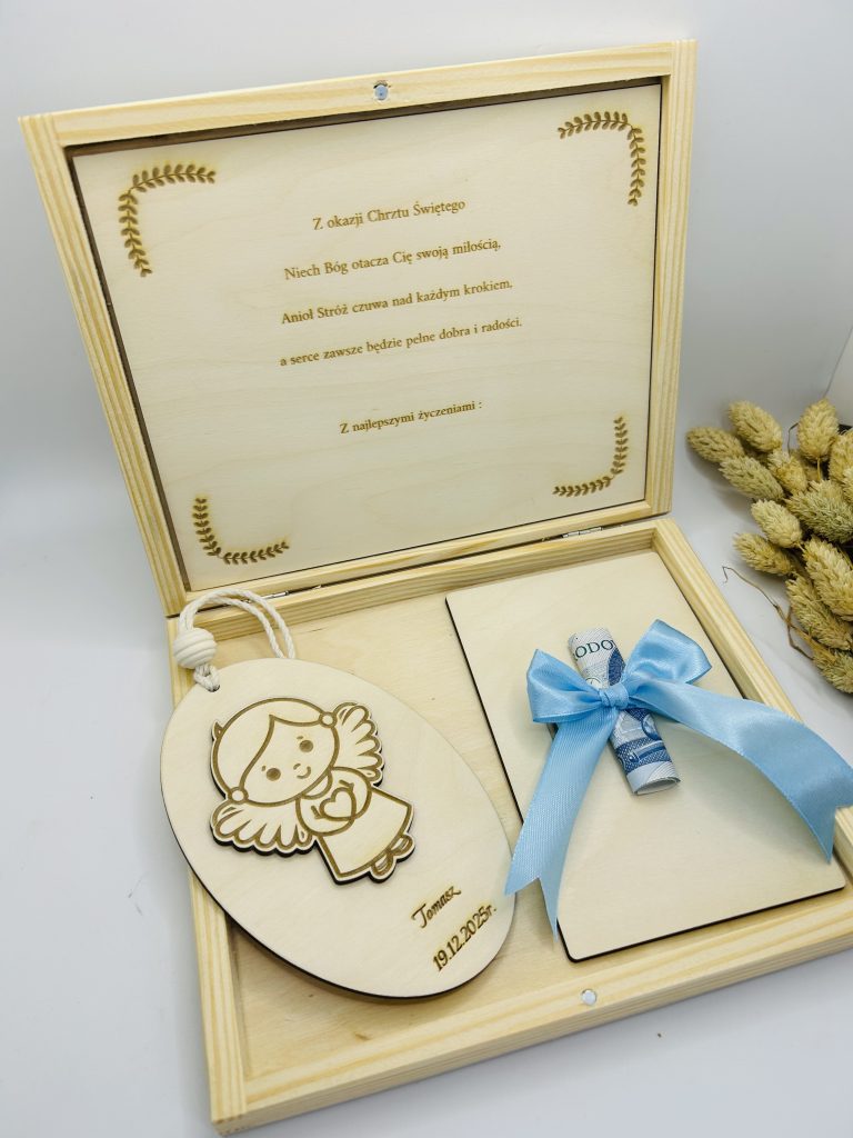 - zestaw: drewniane pudełko + tabliczka ścienna z Aniołkiem
