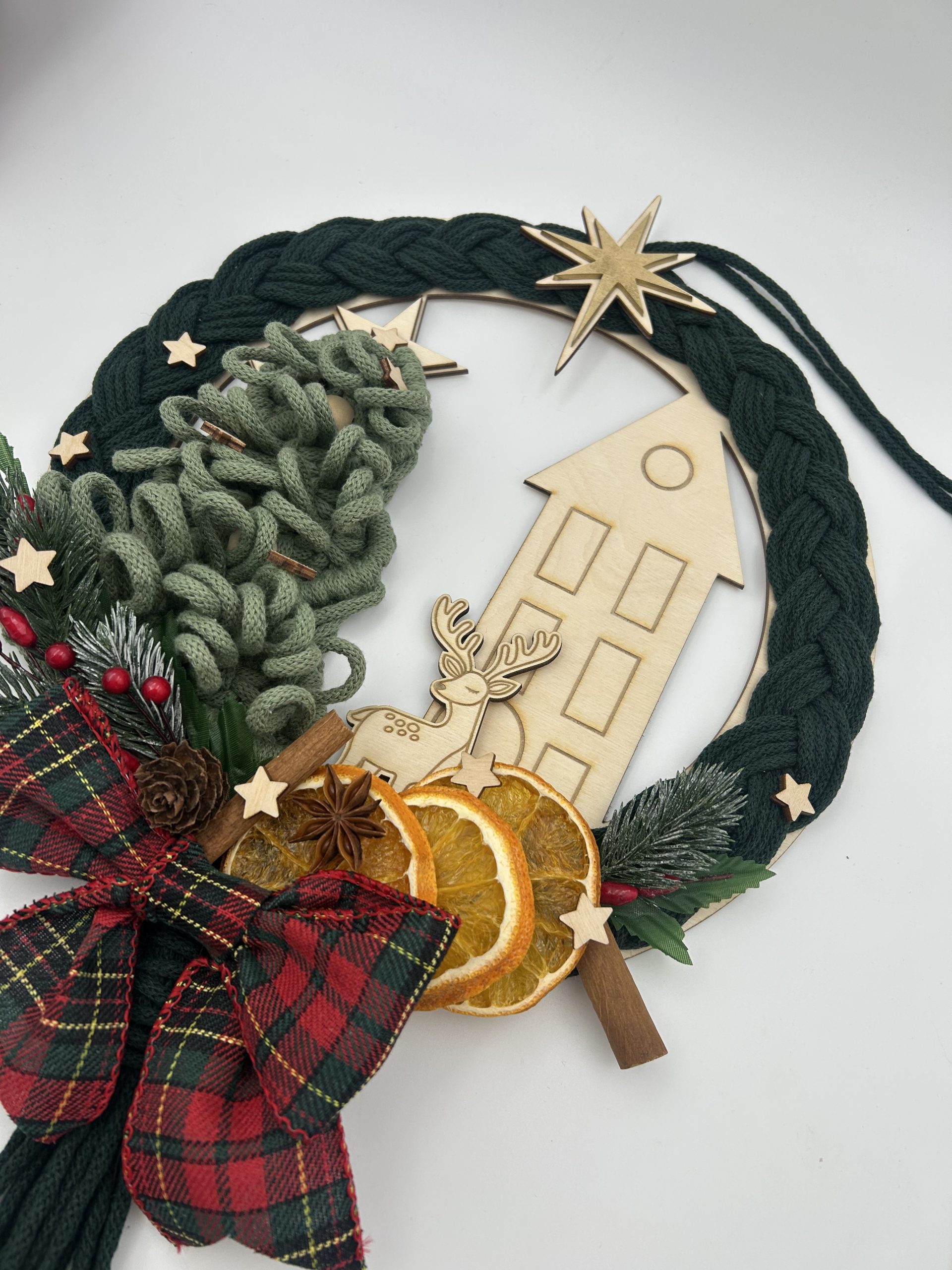 Stwórz wyjątkowy klimat świąt dzięki ręcznie dekorowanemu wianekowi, który łączy naturalne materiały, rękodzieło i świąteczne detale. Wianek opiera się na bazie ze sklejki, ozdobionej sznurkiem metodą makramy, suszonymi owocami, sztucznymi gałązkami choinki oraz uroczym domkiem i jelonkiem. Całość dopełniają miniaturowe gwiazdki, choinka z makramy , kokarda oraz złota gwiazda na szczycie.