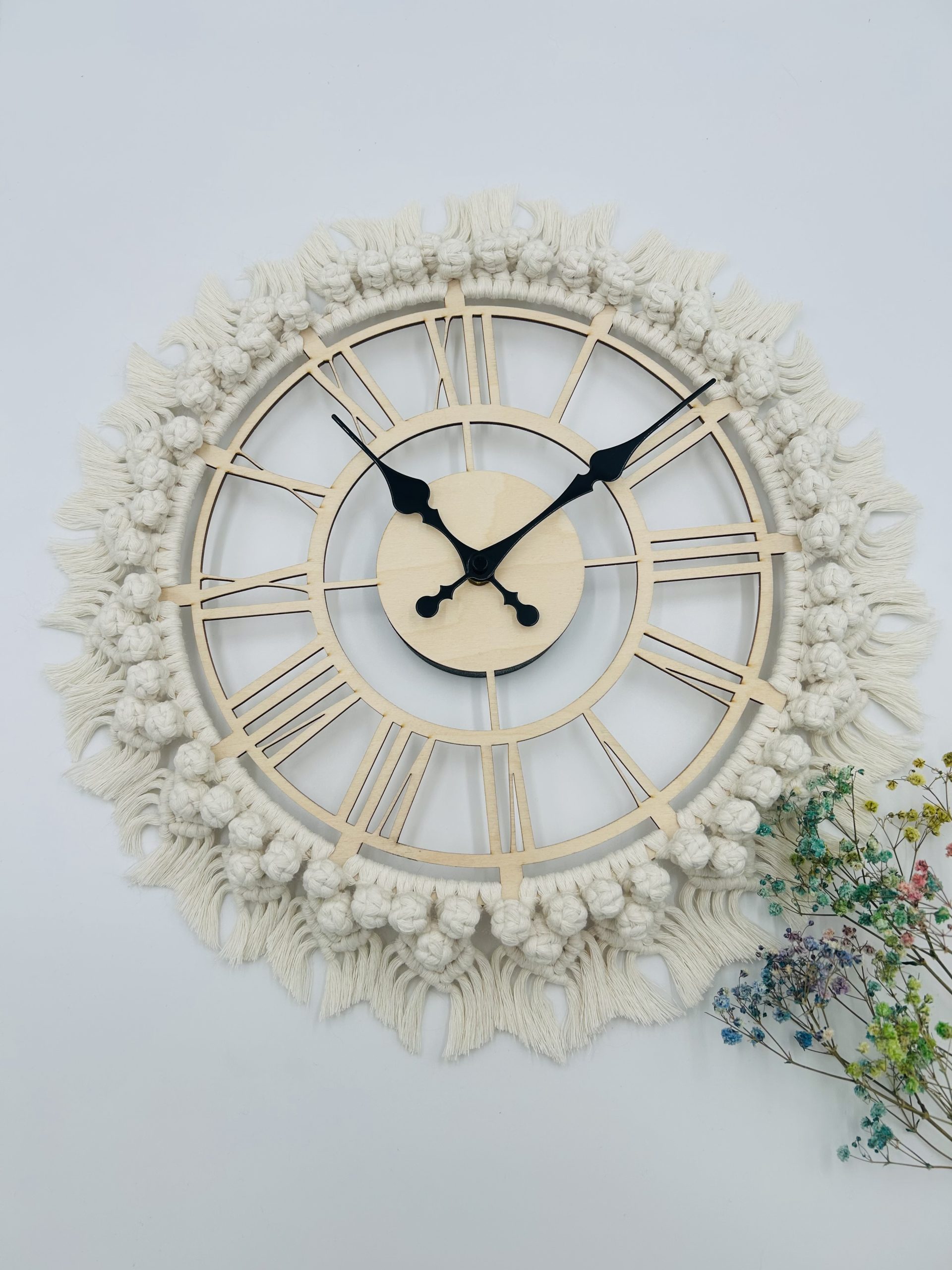 Zegar ze sklejki ozdobiony makramą – 50 cm